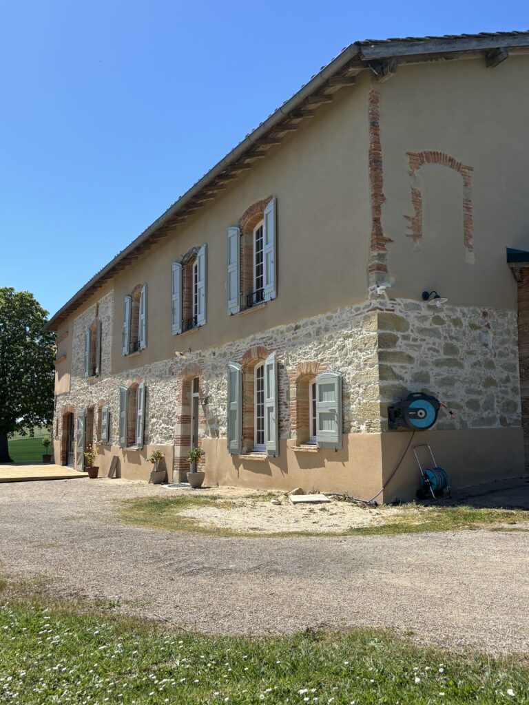 Préparation des supports : Avant de peindre, nous préparons minutieusement les surfaces : protection des sols et fenêtres, lavage au nettoyeur haute pression, un traitement anti mousse, passage d’une couche de fixateur.